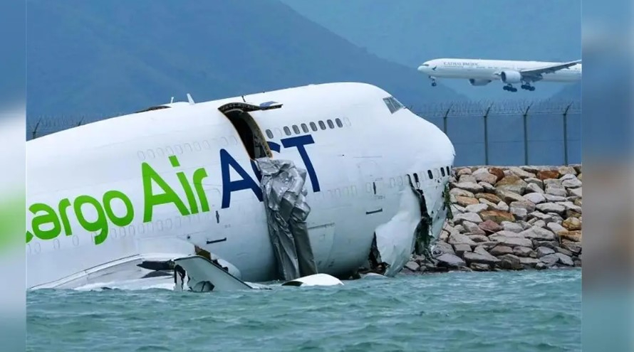 ERNUR.KZ. Гонконг халықаралық әуежайында Boeing 747 жүк ұшағы ұшу-қону жолағынан шығып кетіп, жердегі техникалық қызмет көлігімен соқтығысып, кейін теңізге құлаған, деп жазады azattyq-ruhy.kz.