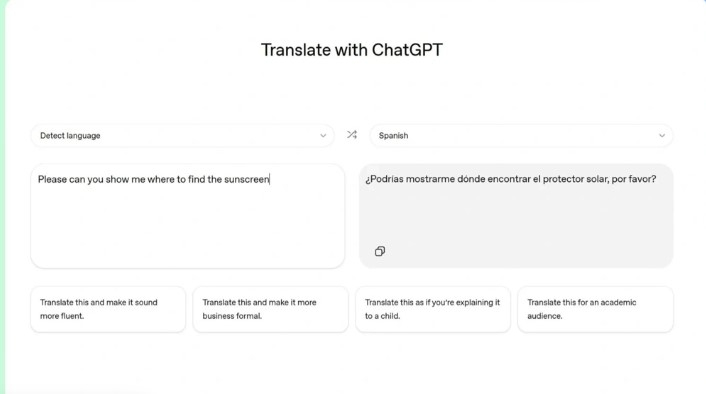 ChatGPT Translate қызметі Google Translate және DeepL тәрізді интерфейске ие. Қазіргі уақытта ол 50-ден астам тілді қолдайды, бұл Google Translate-тің 240-тан астам тілін қолдауымен салыстырғанда аз.