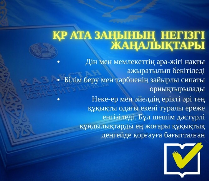 Осылайша, Ата Заңда бекітілген жаңа нормалар мемлекеттің зайырлы қағидаттарын нығайтып, отбасы институтын қорғауға және қоғамдағы тұрақтылық пен құқықтық тәртіпті қамтамасыз етуге қызмет етеді.