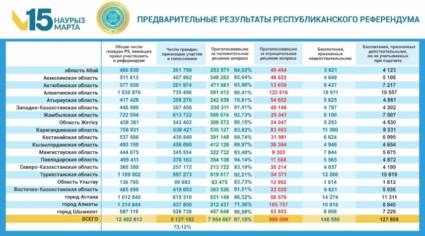 ERNUR.KZ. Алынған мәліметтерге сәйкес, референдумға қатысуға құқығы бар Қазақстан Республикасы азаматтарының жалпы саны 12 миллион 482 мың 613 адамды құрады.