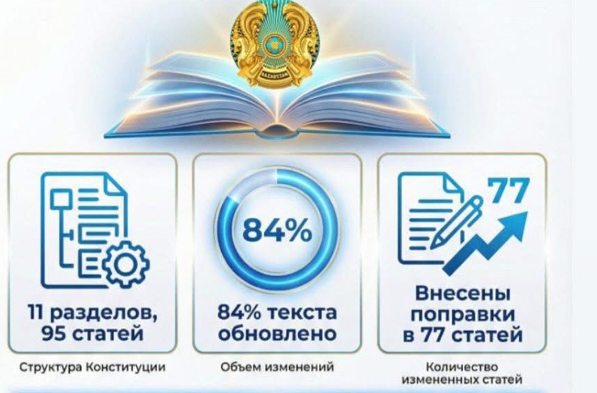 ERNUR.KZ. В Казахстане представлен первый проект новой редакции Конституции, подготовленный в рамках масштабной конституционной реформы. Документ стал результатом широкой общественной дискуссии с участием граждан, политических партий, общественных и профессиональных организаций, а также экспертного сообщества. Проект новой Конституции предусматривает системное обновление Основного закона страны. В частности, предлагается закрепить Преамбулу, 11 разделов и 95 статей. При этом обновлению подверглось 84 процента текста Конституции, а поправки внесены в 77 статей, что свидетельствует о глубине и комплексности проводимых изменений.