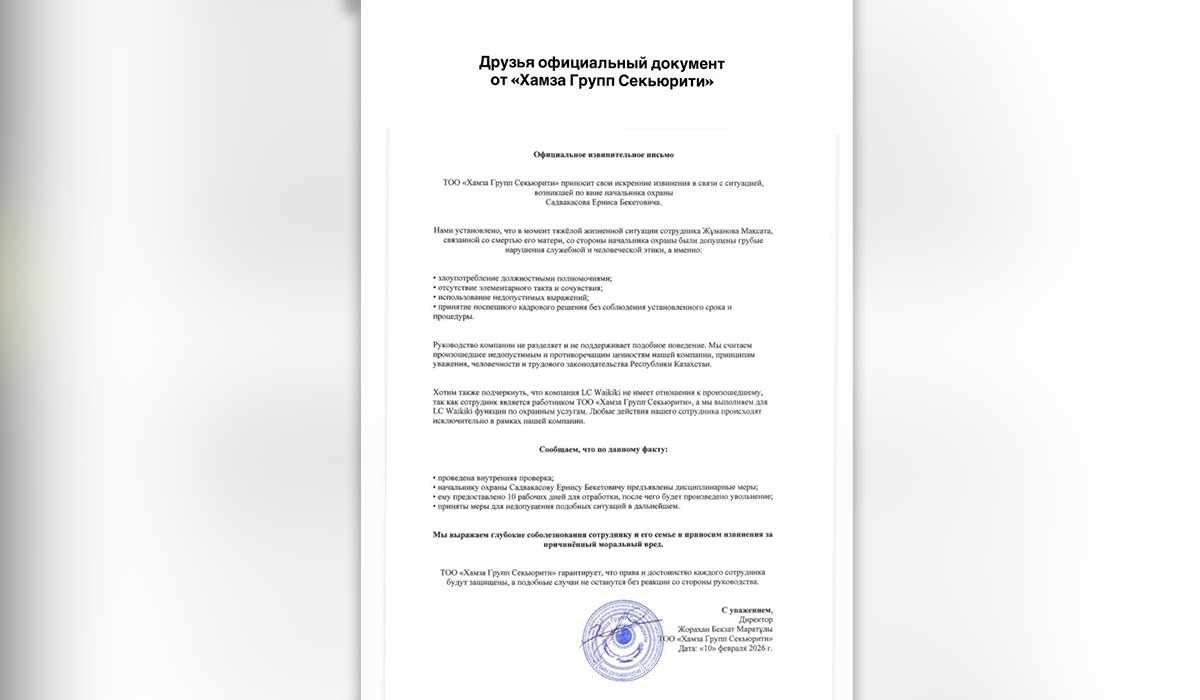 ERNUR.KZ. Семейде анасының қазасы үшін сұранған күзетшіні жұмыстан қуған басшы қызметінен алынды, деп жазады azattyq-ruhy.kz.