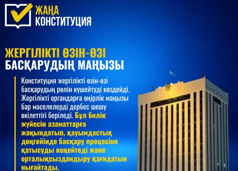 ERNUR.KZ. Қазақстан Республикасының жаңа Конституциясы жергілікті өзін-өзі басқаруды қоғам мен мемлекеттің тиімділігін арттырудың негізгі құралы ретінде қарастырады. Бұл қағида әрбір аймақтың, қала мен ауылдың даму мәселелерін жергілікті деңгейде шешуге, тұрғындардың нақты қажеттіліктеріне жедел жауап беруге мүмкіндік береді.