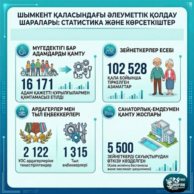 Әлеуметтік көмек көрсету аясында ерекше қажеттіліктері бар азаматтарға да айрықша көңіл бөлінуде. Нақтырақ айтқанда, Шымкент қаласында 16 171 мүгедектігі бар адам қажетті техникалық оңалту құралдарымен қамтамасыз етілген. Бұл – олардың өмір сапасын арттырып, қоғамға бейімделуіне мүмкіндік беретін маңызды қадам.