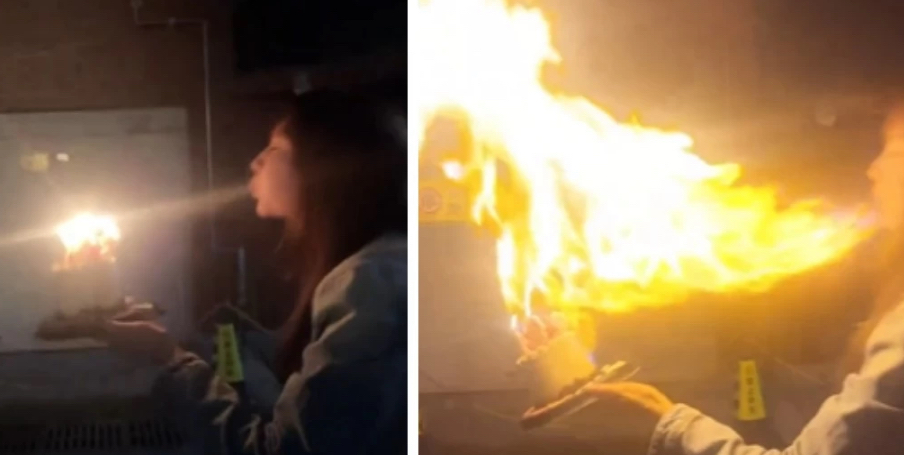 Сол трюкті қайталағысы келген ол достарымен туған күнін тойлап жатқанда далаға шығып, аузына таза спирт алып, шамы жанып тұрған шағын тортқа бүркіген.