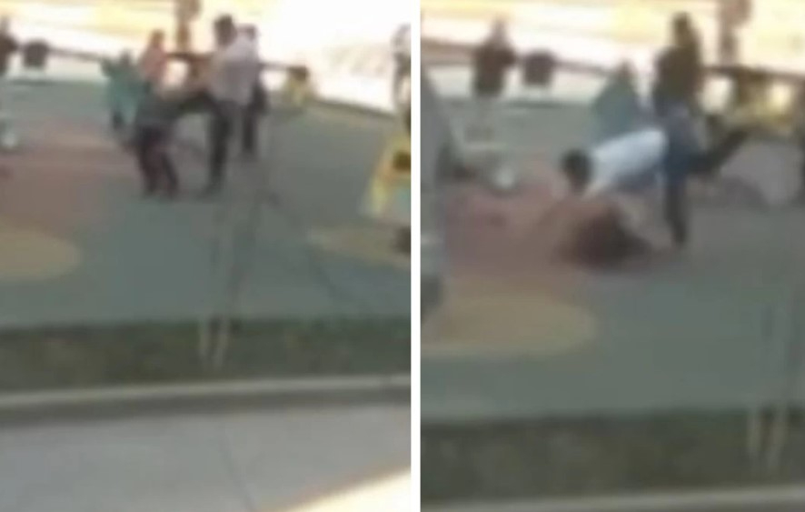 “Каспий” тұрғын үй кешенінің алдында балалар өзара келіспей қалған. Мұны көрген ер адам шамамен 6-7 жасар баланы аямай теуіп жіберді. Бар күшін салғаны соншалық өзі де шалынып құлап қалды. Одан қалды, әйелі баланың құлағынан тартып, сөгіп, оның әжесімен жанжалдасқан.
