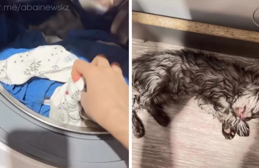 Видеодағы әйелдің айтуынша, бала мысықты кір жуғыш машинаға жасырып қойған. Әйел жануарды байқамай, кір жуғыш машинаны бір сағат киім жууға қосқан.